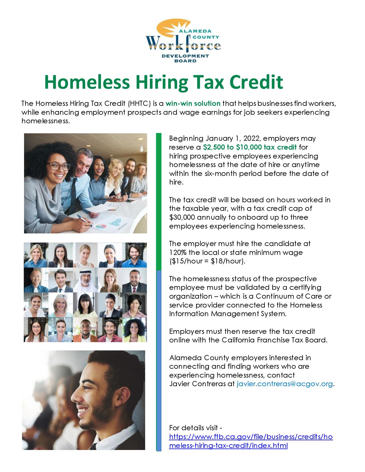 Homeless Hiring Tax Credit provides employers up to $10,000 per individual and up to $30,000 per calendar year when a business hires a person living in a shelter program, the person is temporarily housed, or unsheltered.